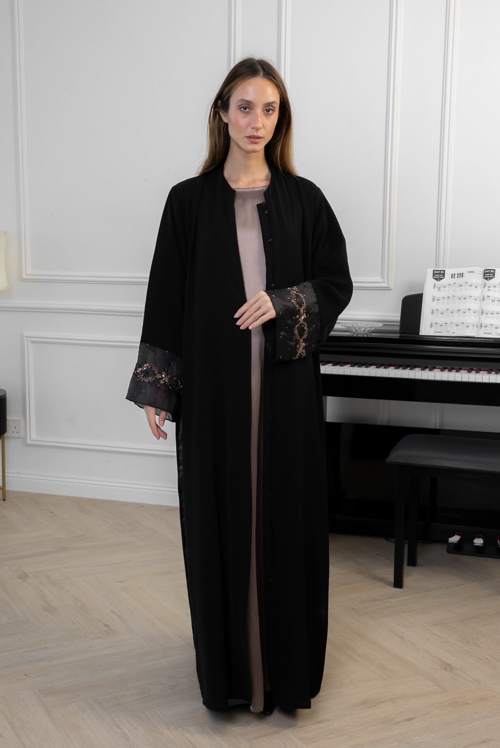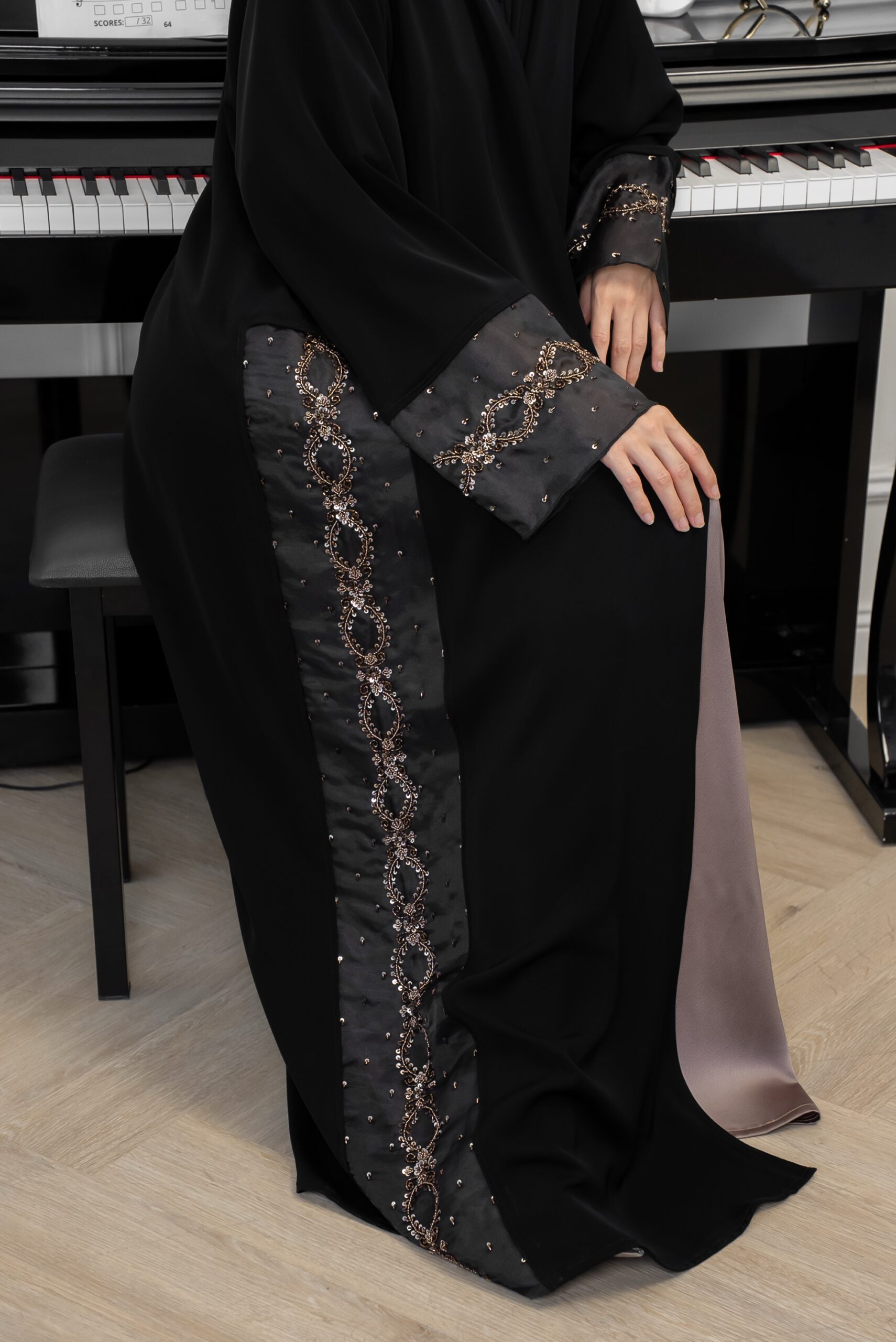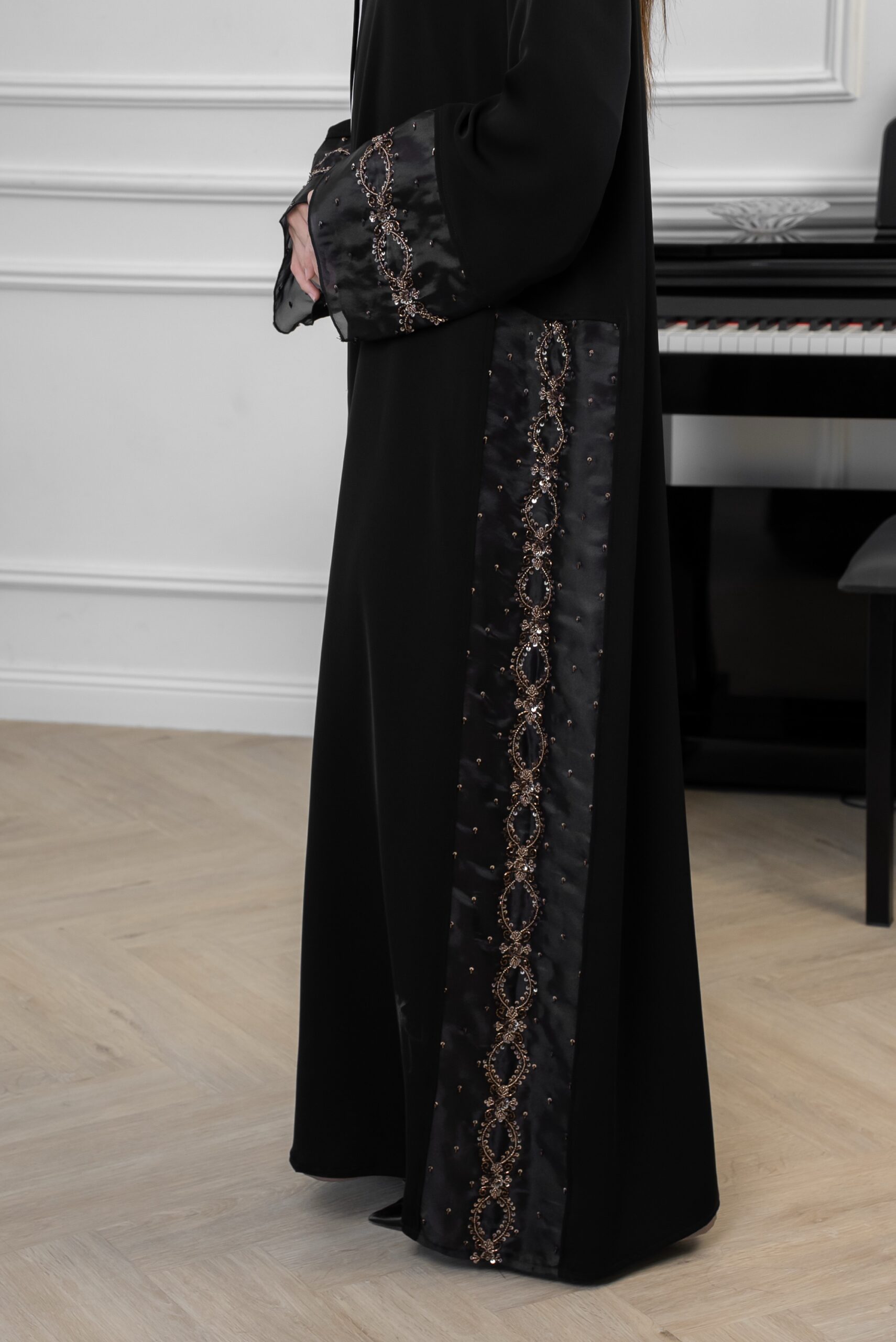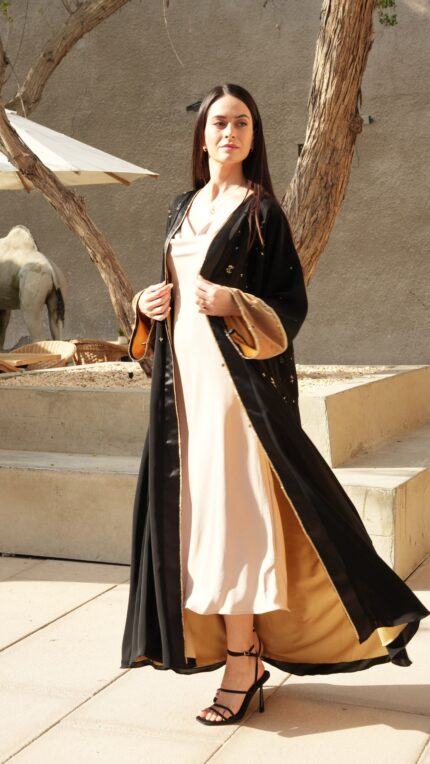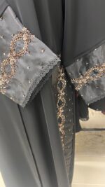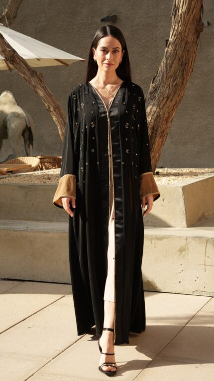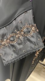 Fabric: Cavalli Nada Korean and Korean organza, elegantly designed with distinctive gold embroidery on the sides and sleeves, for all occasions.